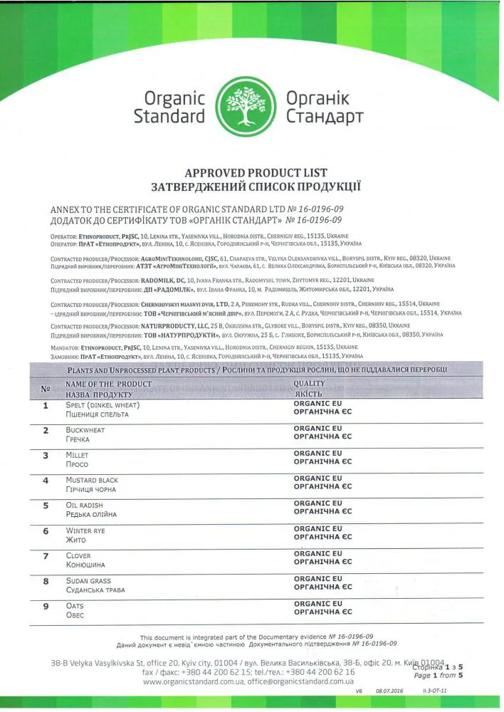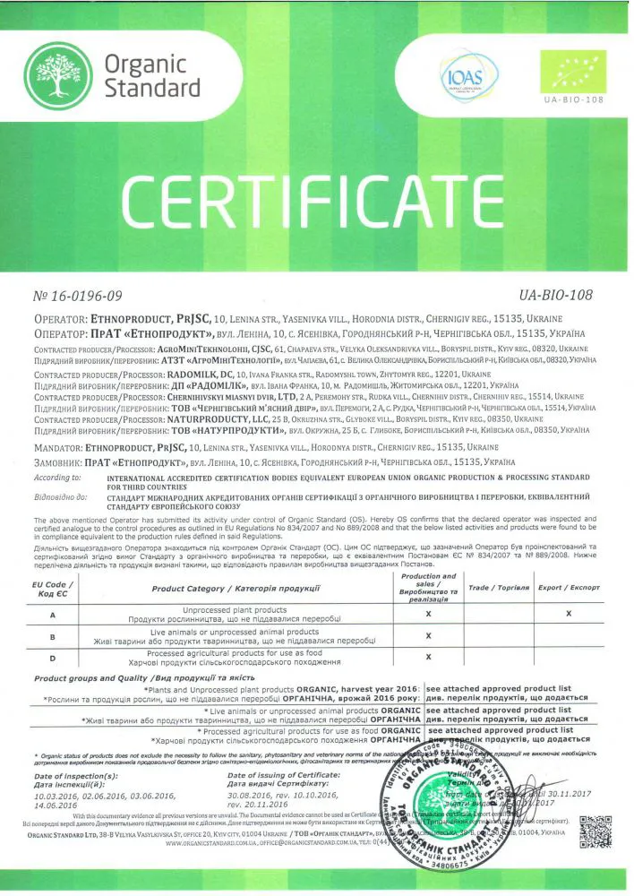 Виробничі процеси компанії ЕтноПродукт сертифіковані міжнародним сертифікаційним органом ТОВ «Органік стандарт» відповідно до вимог, викладених у Рівнозначному стандарті з органічного виробництва та переробки для третіх країн, який еквівалентний Постановам Ради (ЄС) 889/2008 та 834/2007.